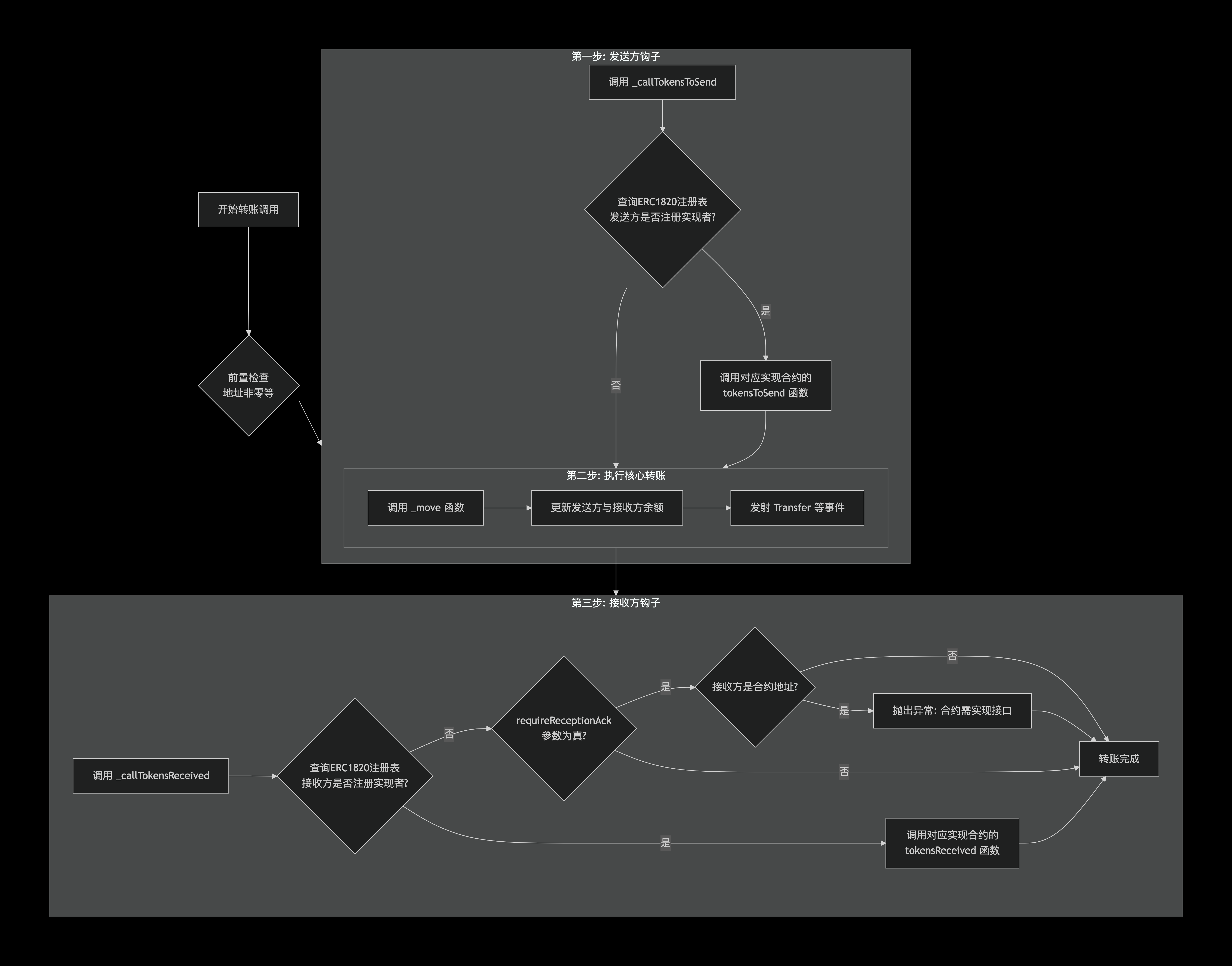 ERC777的核心转账函数(如 send, operatorSend, transfer)都遵循一个精心设计的时序逻辑,下图清晰地展示了这一过程:
